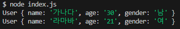 작성한 코드를 실행해 보면 User라는 이름의 객체가 생성된다.
