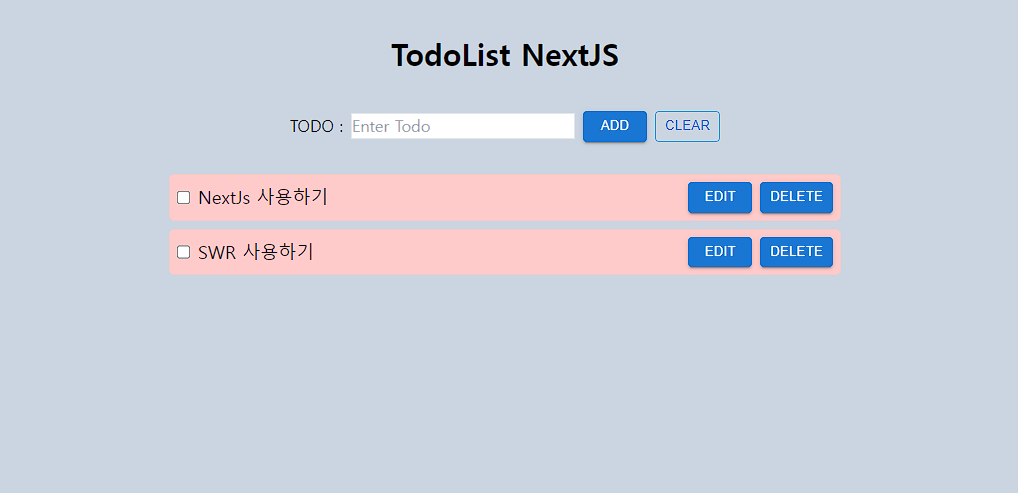 역시 새로운 기술을 사용해서 프로젝트를 만들때는 TodoList만한게 없는거 같다. 그래서 공부중인 Next.Js를 사용하면서 처음 사용해보는 SWR도 같이 써보려고 한다.