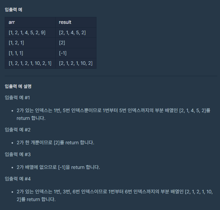 1. 배열에 2가 없는 조건을 먼저 클리어 하기 위해 includes를 사용해서 arr의 배열에 2가 없을 시 [-1]을 리턴 하도록 했다.