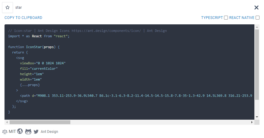 React SVG Icons 사이트는 파일을 다운로드 하는 방식이 아닌 copy해서 사용하는 방식이다. 리액트에 맞는 컴포넌트를 제공하고, Typescript 코드와, React Native 코드 또한 제공해 준다. 나는 svg 코드만 따로 복사해서 사용했다.