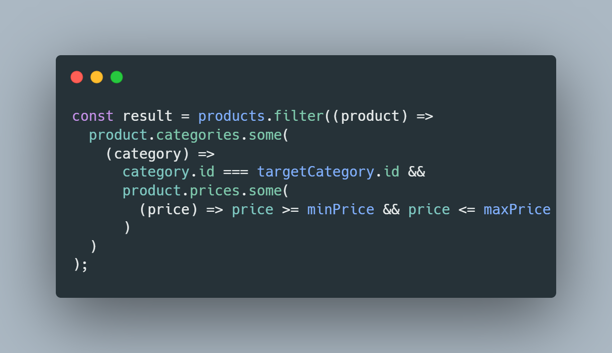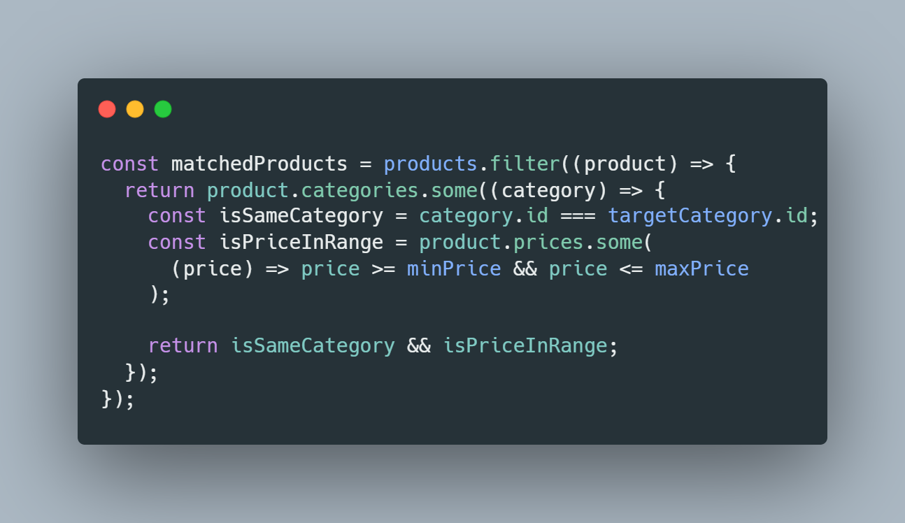 다음 코드는 상품 중에서 카테고리와 가격 범위가 일치하는 상품만 필터링하는 로직이에요.
