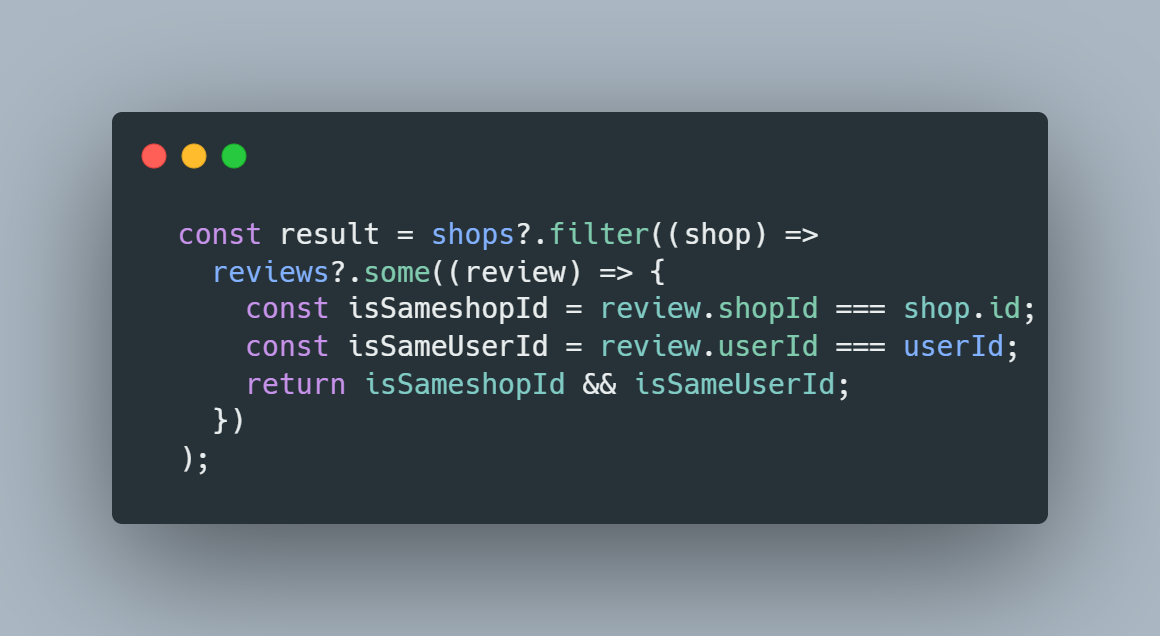 이 코드에서는 익명 함수와 조건이 복잡하게 얽혀 있어요. filter와 some, && 같은 로직이 여러 단계로 중첩되어 있어서 정확한 조건을 파악하기 어려워졌어요.
