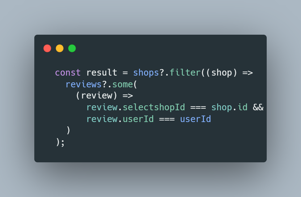 예시 코드와 같이 배열과 배열에서 값을 도출하는 것은 그렇게 많지 않다. 또는 map을 사용해서 배열 안의 값을 props를 통해 하위컴포넌트에서 배열과 props된 값을 비교하곤 한다. 나의 경우는 이렇다. 카카오API에서 제공하는 매장 id값과 유저가 작성한 리뷰의 매장 id 값을 비교해야 되고, 리뷰를 작성한 유저의 id값과 로그인한 유저의 id값을 비교해야 한다. 처음 작성한 코드를 확인해 보자.